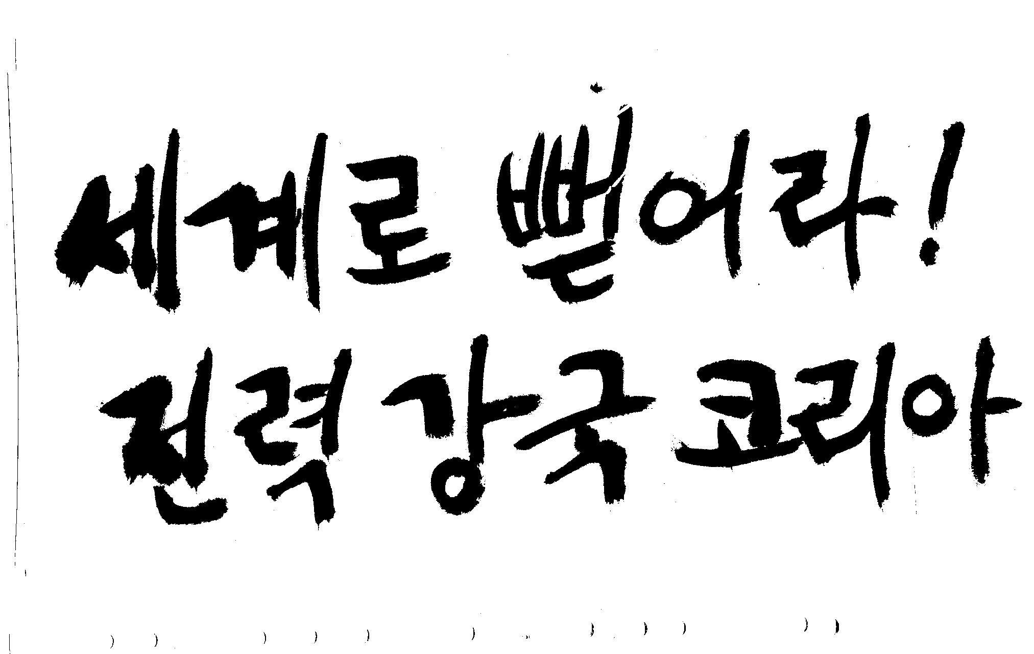 캘리 좀 부탁드려요!~ 김철호 일반 1 10938 2008.12.24 12:09 > > > > > 전력회사 신문광고를 하는데요 캘리로 멋지게 하고픈데 > > 캘리프로그램으로 아무리 써도 느낌이 안나옵니다 ㅜ.ㅜ > > 이런걸 부탁한다는 자체가 너무나도 염치없지만 부탁드립니다. > > > > 세계로 뻗어라! 전력강국 코리아 > > > 보기는 쉬워도 하기는 어려운게 > 세상 모든 일 일겁니다. > 그중에 캘리그라피가 그런것 일 겁니다... > 스캔중에 글꼴이 잘린것은 서로다른글꼴서 편집하시길... > 글수가 많아서 어쩔 수없네요... >
